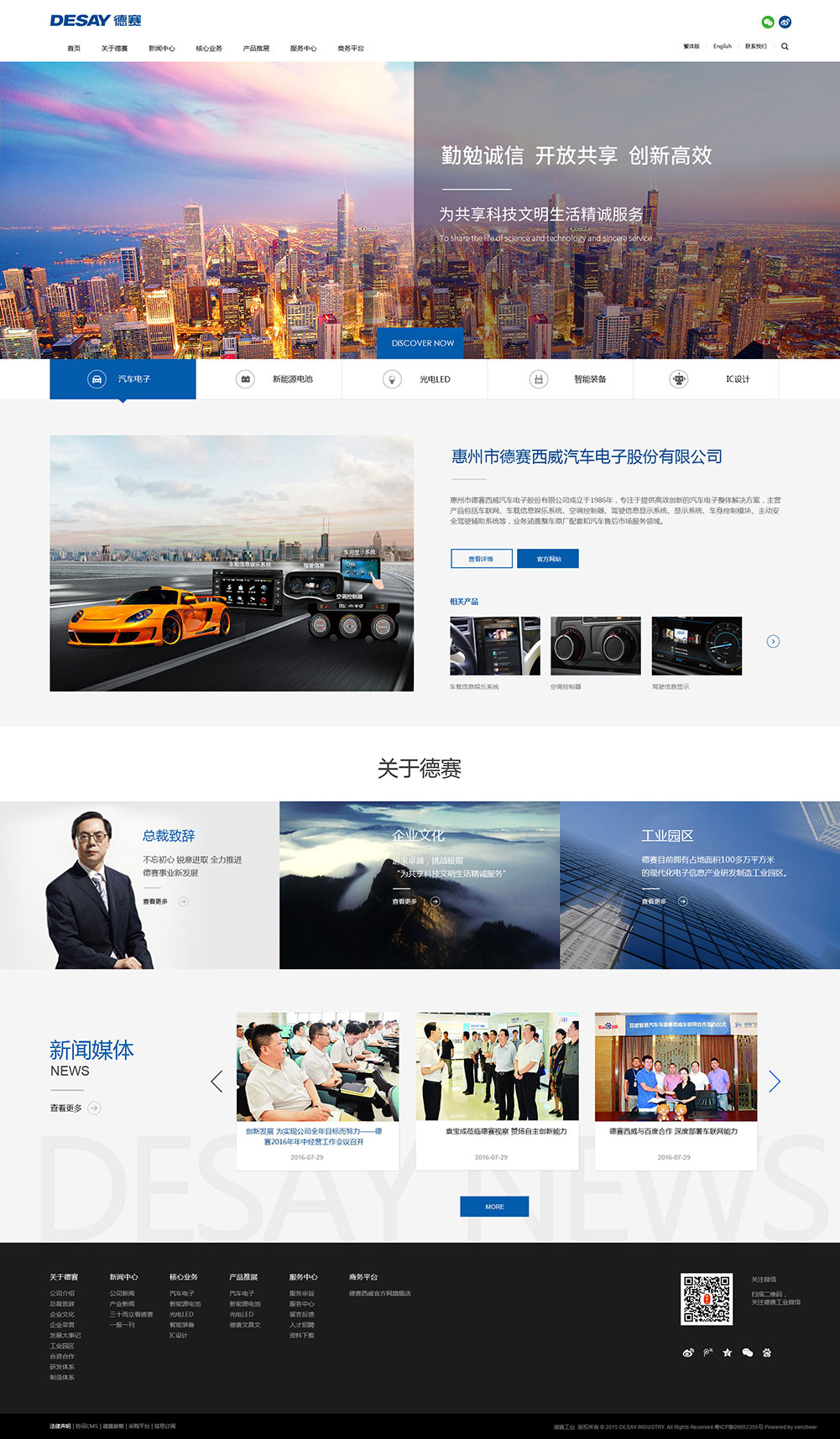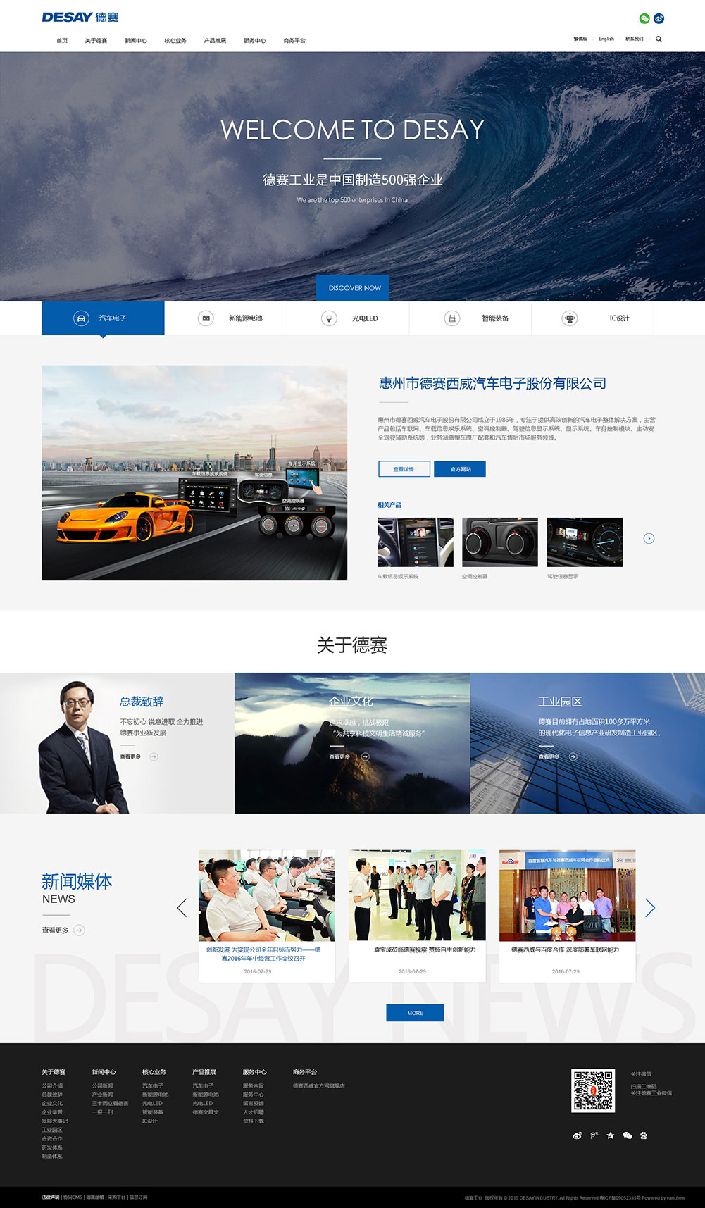 德賽工業創立于1983年,擁有各類合作、合資、全資公司近30家,在美國、德國等國家和地區建立了分支機構,入圍國家制造業500強企業,躋身中國電子信息百強企業前列,是廣東省重點扶持企業,年銷售收入超百億。擁有四大專業工業園區,總面積達100多萬平方米。主營產品:汽車電子、新能源電池、數字視聽、移動通訊、LED光電、IC設計等。